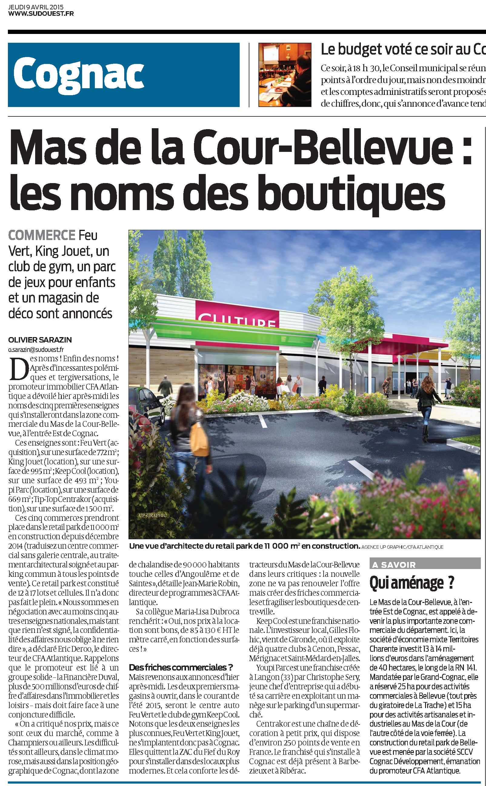Mais revenons aux annonces d’hier après-midi. Les deux premiers magasins à ouvrir, dans le courant de l’été 2015, seront le centre auto Feu Vert et le club de gym Keep Cool. Notons que les deux enseignes les plus connues, Feu Vert et King Jouet, ne s’implantent donc pas à Cognac. Elles quittent la ZAC du Fief du Roy pour s’installer dans des locaux plus modernes. Et cela conforte les détracteurs du Mas de la Cour-Bellevue dans leurs critiques : la nouvelle zone ne va pas renouveler l’offre mais créer des friches commerciales et fragiliser les boutiques de centre-ville.